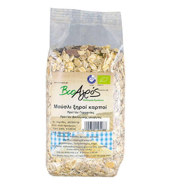 Био мюсли с ядки е смес от зърнени храни и ядки, и представлява една хранителна и балансирана храна, тъй като съдържа в себе си голямо количество ядливи влакнини и протеини. Мюслито доставя енергия и едновременно с това е добър вариант за здравословно и диетично хранене. Комбинира се с прясно и кисело мляко, сок или други напитки.