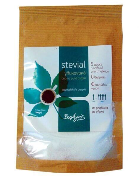 Стевията е дребен храст, познат под името Stevia Rebaudiana, в чиито листа се съдържа стевиол, считан за най-сладката съставка на растението. Комбиниран с еритритол – алкохолна съставка, съдържаща се в плодовете и зеленчуците, се получава Stevial. Той е висококачествен продукт с приятен вкус. Има кристална форма като захарта, но съдържа 0 калории. Състав: Еритритол, сладък Стевиол (Rebaudiana A 98%). Продукт на био земеделие. Прекомерната употреба на продукта може да предизвика слабително действие. След отваряне да се съхранява на сухо място. |