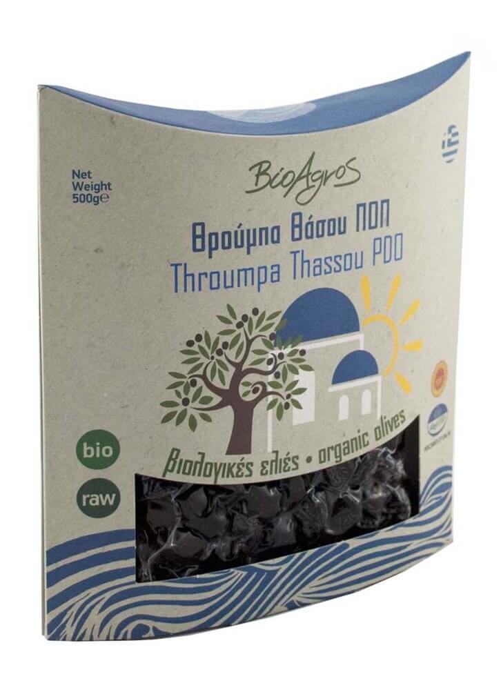 Продукт с отлично качество - сурови черни полу-сушени Био маслини Трумба, леко осолени, от маслиновите био градини на о-в Тасос.