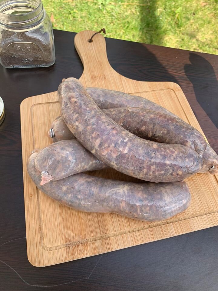 Телешка наденица от чисто мляно место с 10% съдържание на свинска шарена сланина – добавена за допълнителна сочност. Овкусена с традиционни български подправки: кимион, домашна ронена чубрица, домашен чевен пипер, сол, черен пипер. Пълнени са в естествени черва. Подходящи за скара, барбекю, фурна и сушене.