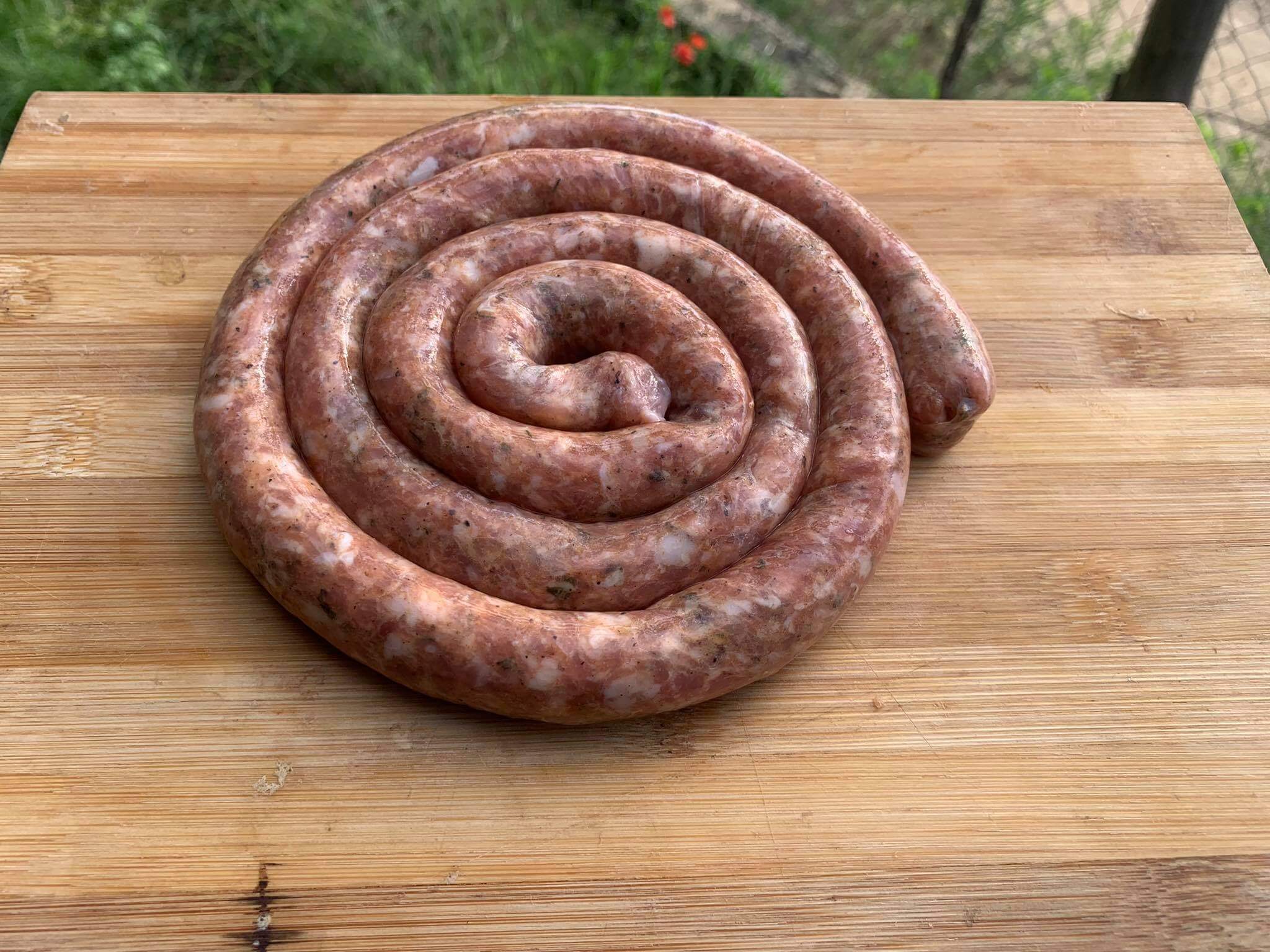 Свинско карначе от ферма Бредас. Състав: свинско месо, сланина, черен пипер, червен пипер, бахар, кимион , чесън на прах , чубрица