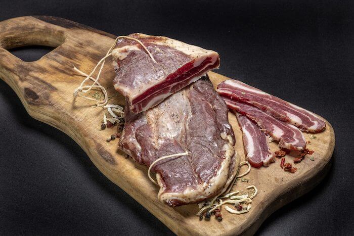 Сурово-сушен специалитет от ферма Бредас. Приготвен от нашия охладен свински бекон , овкусен с натурални подправки , студено-пушен с дъбова дървесина, бавно сушен по специална технология.