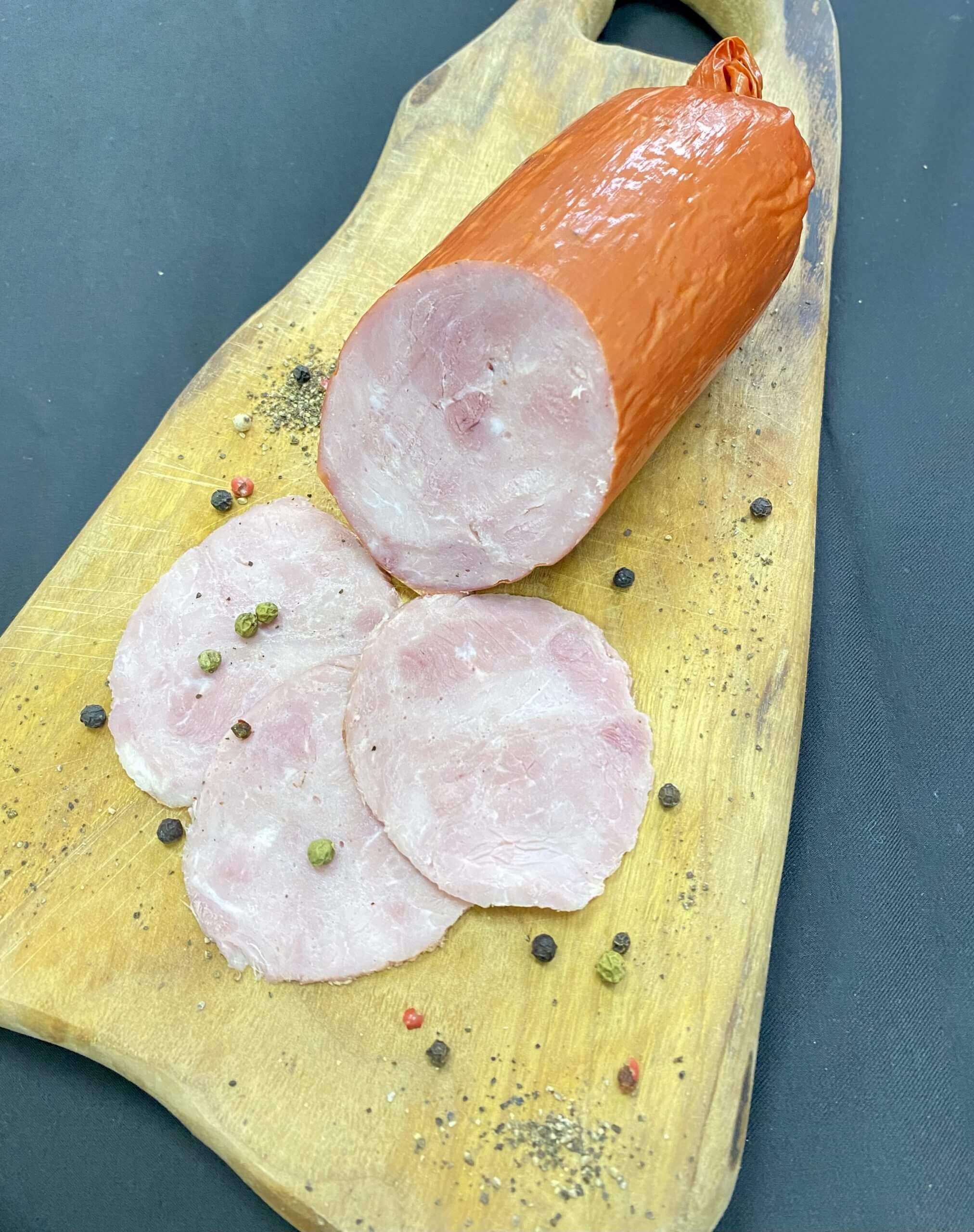 Варено-пушен траен колбас от 100% охладен свински бут, с натурални подправки, опушен с дъбова дървесина. С много ниско съдържание на мазнини, приготвен по семейна рецепта.